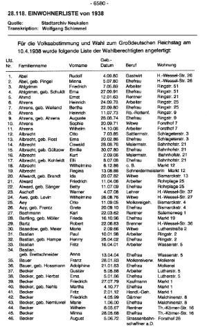 Diese Liste der Wahlberechtigten für die Volksabstimmung und Wahl zum Großdeutschen Reichstag am 10.4.1938 basiert auf der Einwohnerliste 1938 von Neukalen.