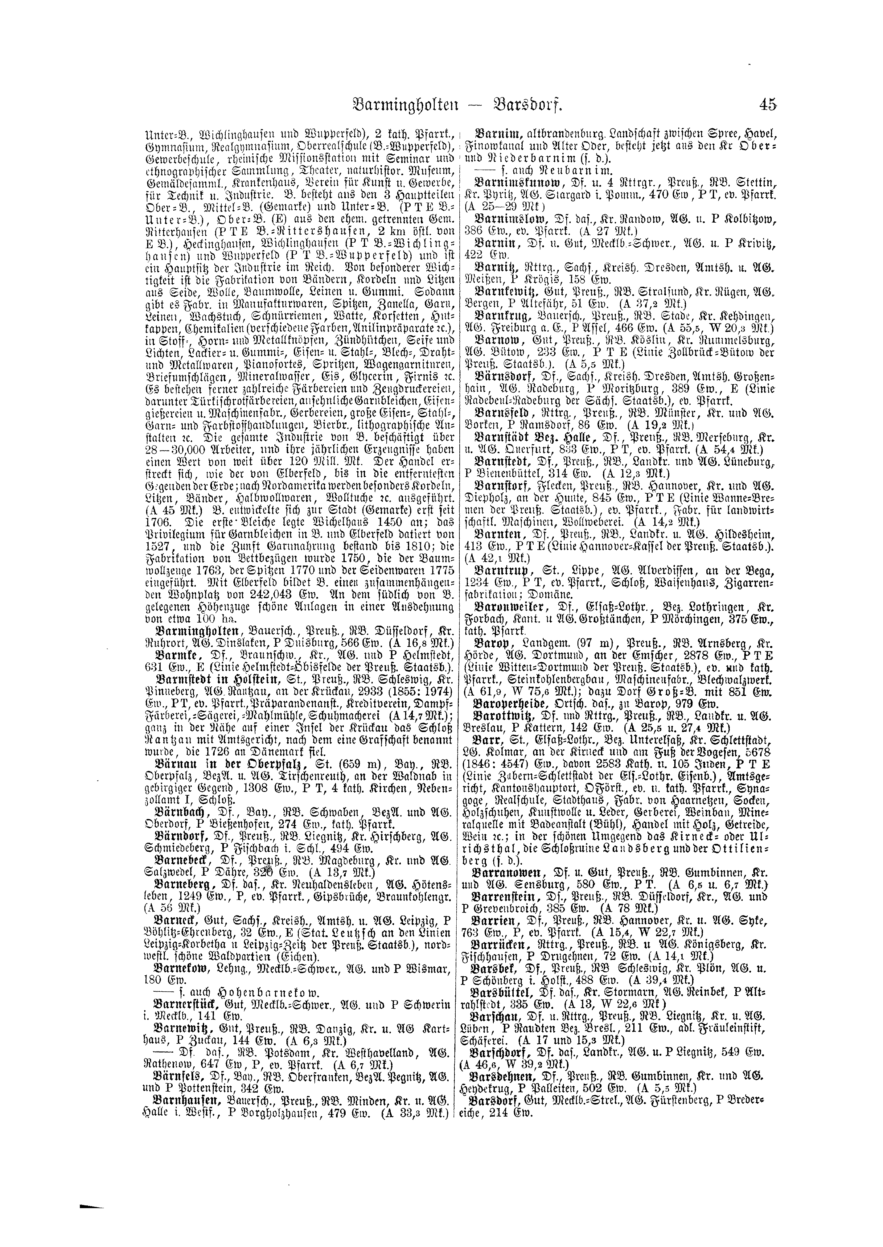 - Unter-B., Wichlinghausen und Wupperfeld), 2 kath. Pfarrk., Gymnasium, Realgymnasium, Oberrealschule (B.-Wupperfeld), Gewerbeschule, rheinische Missionsstation mit Seminar und ethnographischer Sammlung, Theater, naturhistor. Museum, Gemäldesamml., Krankenhaus, Verein für Kunst u. Gewerbe., für Technik u. Industrie. B. besteht aus den 3 Hauptteilen Ober-B., Mittel-B. (Gemarke) und Unter-B. (P T E B.-Unter-B.), Ober-B. (E) aus den ehem. getrennten Gem. Ritterhausen (P T E B.-Rittershausen, 2 km östl. von E B.), Heckinghausen, Wichlinghausen (P T B.-Wichlinghausen) und Wupperfeld (P T B.-Wupperfeld) und ist ein Hauptsitz der Industrie im Reich. Von besonderer Wichtigkeit ist die Fabrikation von Bändern, Kordeln und Litzen aus Seide, Wolle, Baumwolle, Leinen u. Gummi. Sodann gibt es Fabr. in Manufakturwaren, Spitzen, Zanella, Garn, Leinen, Wachstuch, Schnürriemen, Watte, Korsetten, Hutkappen, Chemikalien (verschiedene Farben, Anilinpräparate ec.), in Stoff-, Horn- und Metallknöpfen, Zündhütchen, Seife und Lichten, Lackier- u. Gummi-, Eisen- u. Stahl-, Blech-, Draht- und Metallwaren, Pianofortes, Spritzen, Wagengarnituren, Briefumschlägen, Mineralwasser, Eis, Glycerin, Firnis etc. Es bestehen ferner zahlreiche Färbereien und Zeugdruckereien, darunter Türkischrotfärbereien, ansehnliche Garnbleichen, Eisengießereien u. Maschinenfabr., Gerbereien, große Eisen-, Stahl-, Garn- und Farbstoffhandlungen, Bierbr., lithographische Anstalten etc. Die gesamte Industrie von B. beschäftigt über 28-30,000 Arbeiter, und ihre jährlichen Erzeugnisse haben einen Wert von weit über 120 Mill. Mk. Der Handel erstreckt sich, wie der von Elberfeld, bis in die entferntesten Gegenden der Erde; nach Nordamerika werden besonders Kordeln, Litzen, Bänder, Halbwollwaren, Wolltuche etc. ausgeführt. (A 45 Mk.) B. entwickelte sich zur Stadt (Gemarke) erst seit 1706. Die erste Bleiche legte Wichelhaus 1450 an; das Privilegium für Garnbleichen in B. und Elberfeld datiert von 1527, und die Zunft Garnnahrung bestand bis 1810; die Fabrikation von Bettbezügen wurde 1750, die der Baumwollzeuge 1763, der Spitzen 1770 und der Seidenwaren 1775 eingeführt. Mit Elberfeld bildet B. einen zusammenhängenden Wohnplatz von 242,043 Ew. An dem südlich von B. gelegenen Höhenzuge schöne Anlagen in einer Ausdehnung von etwa 100 ha.