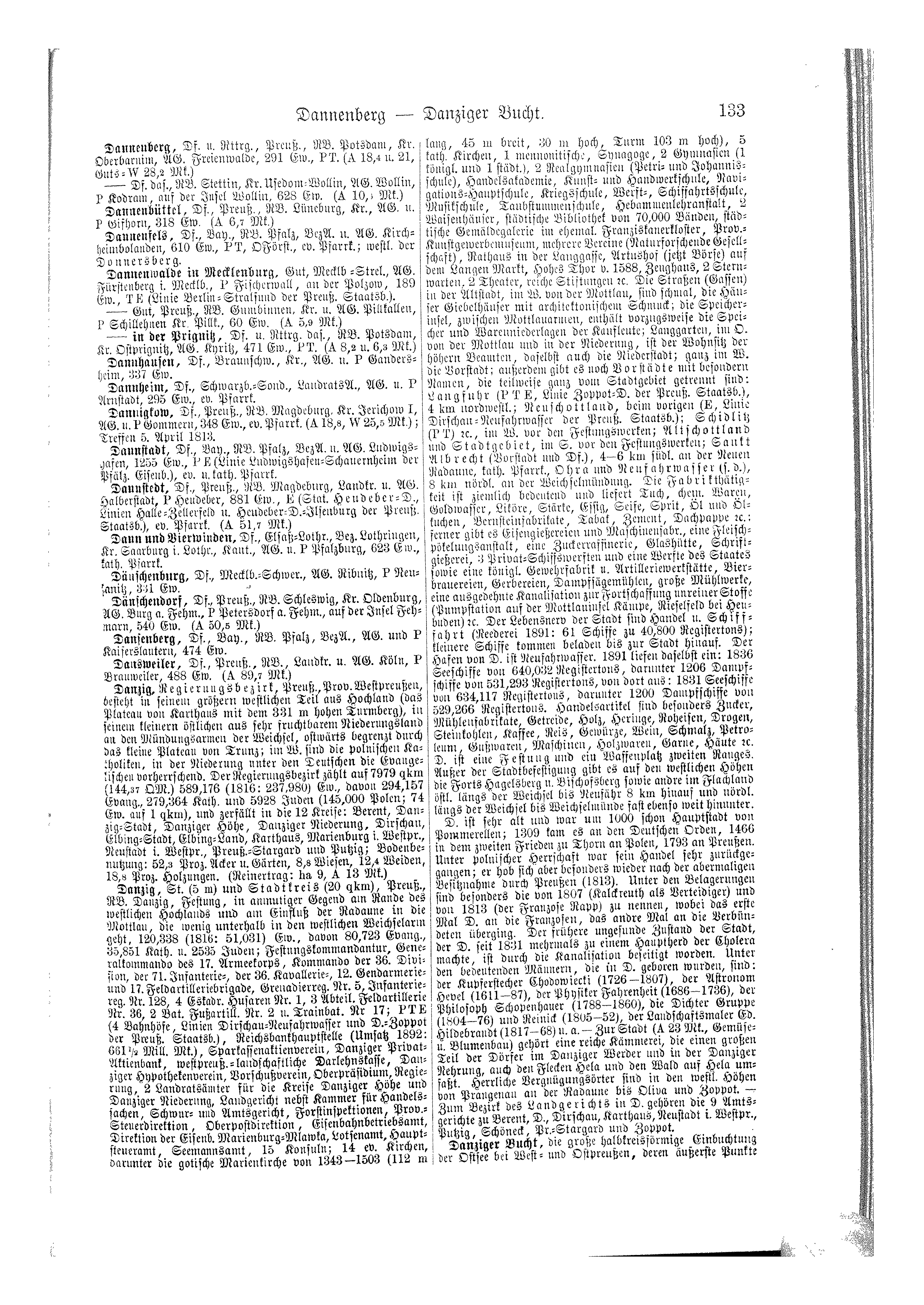 - St. (5 m) und Stadtkreis (20 qkm), Preuß., RB. Danzig, Festung, in anmutiger Gegend am Rande des westlichen Hochlands und am Einfluß der Radaune in die Mottlau, die wenig unterhalb in den westlichen Weichselarm geht, 120,338 (1816: 51,031) Ew., davon 80,723 Evang., 35,851 Kath. u. 2535 Juden; Festungskommandantur, Generalkommando des 17. Armeekorps, Kommando der 36. Division, der 71. Infanterie-, der 36. Kavallerie-, 12. Gendarmerie- und 17. Feldartilleriebrigade, Grenadierreg. Nr. 5, Infanteriereg. Nr. 128, 4 Eskadr. Husaren Nr. 1, 3 Abteil. Feldartillerie Nr. 36, 2 Bat. Fußartill. Nr. 2 u. Trainbat. Nr. 17; P T E (4 Bahnhöfe, Linien Dirschau-Neufahrwasser und D.-Zoppot der Preuß. Staatsb.), Reichsbankhauptstelle (Umsatz 1892: 661 ½ Mill. Mk.), Sparkassenaktienverein, Danziger Privat-Aktienbank, westpreuß.-landschaftliche Darlehnskasse, Danziger Hypothekenverein, Vorschußverein, Oberpräsidium, Regierung, 2 Landratsämter für die Kreise Danziger Höhe und Danziger Niederung, Landgericht nebst Kammer für Handelssachen, Schwur- und Amtsgericht, Forstinspektionen, Prov.-Steuerdirektion, Oberpostdirektion, Eisenbahnbetriebsamt, Direktion der Eisenb. Marienburg-Mlawka, Lotsenamt, Hauptsteueramt, Seemannsamt, 15 Konsuln; 14 ev. Kirchen, darunter die gotische Marienkirche von 1343 – 1503 (112 m lang, 45 m breit, 30 m hoch, Turm 103 m hoch), 5 kath. Kirchen, 1 mennonitische, Synagoge, 2 Gymnasien (1 königl. Und 1 städt.), 2 Realgymnasien (Petri- und Johannisschule), Handelsakademie, Kunst- und Handwerkschule, Navigations-Hauptschule, Kriegsschule, Werft-, Schiffahrtsschule, Musikschule, Taubstummenschule, Hebammenlehranstalt, 2 Waffenhäuser, städtische Bibliothek von 70,000 Bänden, städtische Gemäldegalerie im ehemal. Franziskanerkloster, Prov.-Kunstgewerbemuseum, mehrere Vereine (Naturforschende Gesellschaft), Rathaus in der Langgasse, Artushof (jetzt Börse) auf dem Langen Markt, Hohes Thor v. 1588, Zeughaus, 2 Sternwarten, 2 Theater, reiche Stiftungen etc. Die Straßen (Gassen) in der Altstadt, im W. von der Mottlau, sind schmal, die Häuser Giebelhäuser mit architektonischem Schmuck; die Speicherinsel, zwischen Mottlauarmen, enthält vorzugsweise die Speicher und Warenniederlagen der Kaufleute; Langgarten, im O. von der Mottlau und in der Niederung, ist der Wohnsitz der höhern Beamten, daselbst auch die Niederstadt; ganz im W. die Vorstadt; außerdem gibt es noch Vorstädte mit besondern Namen, die teilweise ganz vom Stadtgebiet getrennt sind: Langfuhr (P T E, Linie Zoppot-D. der Preuß. Staatsb.), 4 km nordwestl.; Neuschottland, beim vorigen (E, Linie Dirschau-Neufahrwasser der Preuß. Staatsb.); Schidlitz (P T) etc., im W. vor den Festungswerken; Altschottland und Stadtgebiet, im S. vor den Festungswerken; Sankt Albrecht (Vorstadt und Df.), 4 – 6 km südl. an der Neuen Radaune, kath. Pfarrk., Ohra und Neufahrwasser (s. d.), 8 km nördl. an der Weichselmündung. Die Fabrikthätigkeit ist ziemlich bedeutend und liefert Tuch, chem. Waren, Goldwasser, Liköre, Stärke, Essig, Seife, Sprit, Öl und Ölkuchen, Bernsteinfabrikate, Tabak, Zement, Dachpappe etc.: ferner gibt es Eisengießereien und Maschinenfabr., eine Fleischpökelungsanstalt, eine Zuckerraffinerie, Glashütte, Schriftgießerei, 3 Privat-Schiffswerften und eine Werfte des Staates sowie eine königl. Gewehrfabrik u. Artilleriewerkstätte, Bierbrauereien, Gerbereien, Dampfsägemühlen, große Mühlwerke, eine ausgedehnte Kanalisation zur Fortschaffung unreiner Stoffe (Pumpstation auf der Mottlauinsel Kämpe, Rieselfeld bei Heubuden) etc. Der Lebensnerv der Stadt sind Handel u. Schiffahrt (Reederei 1891: 61 Schiffe zu 40,800 Registertons); kleinere Schiffe kommen beladen bis zur Stadt hinauf. Der Hafen von D. ist Neufahrwasser. 1891 liefen daselbst ein: 1836 Seeschiffe von 640,032 Registertons, darunter 1206 Dampfschiffe von 531,293 Registertons, von dort aus: 1831 Seeschiffe von 634,117 Registertons, darunter 1200 Dampfschiffe von 529,266 Registertons. Handelsartikel sind besonders Zucker, Mühlenfabrikate, Getreide, Holz, Heringe, Roheisen, Drogen, Steinkohlen, Kaffee, Reis, Gewürze, Wein, Schmalz, Petroleum, Gußwaren, Maschinen, Holzwaren, Garne, Häute etc. D. ist eine Festung und ein Waffenplatz zweiten Ranges. Außer der Stadtbefestigung gibt es auf den westlichen Höhen die Forts Hagelsberg u. Bischofsberg sowie andre im Flachland östl. längs der Weichsel bis Neufähr 8 km hinauf und nördl. längs der Weichsel bis Weichselmünde fast ebenso weit hinunter. D. ist sehr alt und war um 1000 schon Hauptstadt von Pommerellen; 1309 kam es an den Deutschen Orden, 1466 in dem zweiten Frieden zu Thorn an Polen, 1793 an Preußen. Unter polnischer Herrschaft war sein Handel sehr zurückgegangen; er hob sich aber besonders wieder nach der abermaligen Besitznahme durch Preußen (1813). Unter den Belagerungen sind besonders die von 1807 (Kalckreuth als Verteidiger) und von 1813 (der Franzose Rapp) zu nennen, wobei das erste Mal D. an die Franzosen, das andre Mal an die Verbündeten überging. Der frühere ungefunde Zustand der Stadt, der D. seit 1831 mehrmals zu einem Hauptherd der Cholera machte, ist durch die Kanalisation beseitigt worden. Unter den bedeutenden Männern, die in D. geboren wurden, sind: der Kupferstecher Chodowiecki (1726 – 1807), der Astronom Hevel (1611 – 87), der Physiker Fahrenheit (1686 – 1736), der Philosoph Schopenhauer (1788 – 1860), die Dichter Gruppe (1804 – 76) und Reinick (1805 – 52), der Landschaftsmaler Ed. Hildebrandt (1817 – 68) u. a. – Zur Stadt (A 23 Mk., Gemüse- u. Blumenbau) gehört eine reiche Kämmerei, die einen großen Teil der Dörfer im Danziger Werder und in der Danziger Nehrung, auch den Flecken Hela und den Wald auf Hela umfaßt. Herrliche Vergnügungsörter sind in den westl. Höhen von Prangenau an der Radaune bis Oliva und Zoppot. – Zum Bezirk des Landgerichts in D. gehören die 9 Amtsgerichte zu Berent, D., Dirschau, Karthaus, Neustadt i. Wes