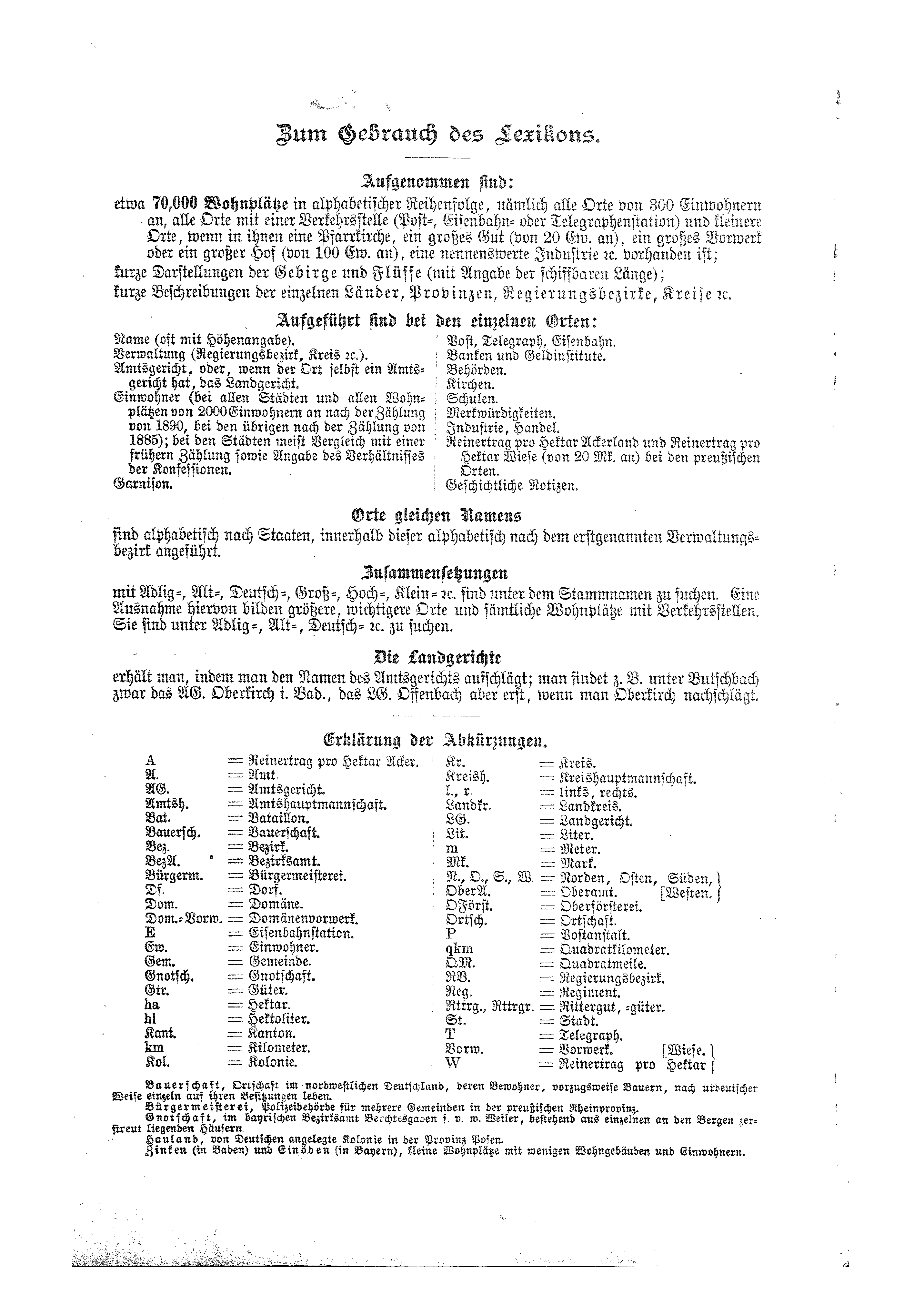 - etwa 70.000 Wohnplätze in alphabetischer Reihenfolge, nämlich alle Orte von 300 Einwohnern an, alle Orte mit einer Verkehrsstelle (Post-, Eisenbahn- oder Telegraphenstation) und kleinere Orte, wenn in ihnen eine Pfarrkirche, ein großes Gut (von 20 Ew. an), ein großes Vorwerk oder ein großer Hof (von 100 Ew. an), eine nennenswerte Industrie etc. vorhanden ist;