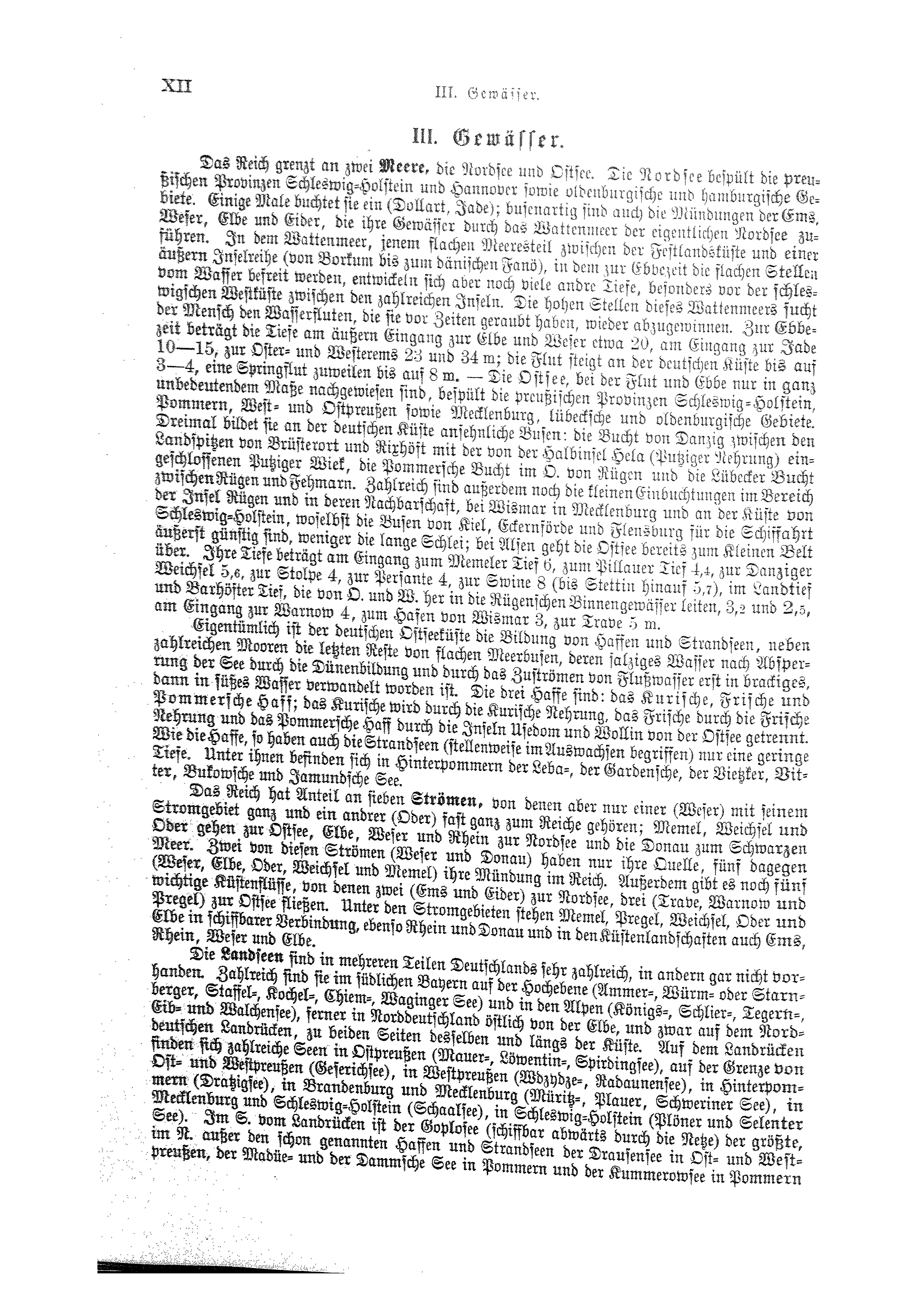Das Reich grenzt an zwei Meere, die Nordsee und Ostsee. Die Nordsee bespült die Preußischen Provinzen Schleswig-Holstein und Hannover sowie oldenburgische und hamburgische Gebiete. Einige Male buchtet sie ein (Dollart, Jade); busenartig sind auch die Mündungen der Ems, Weser, Elbe und Eider, die ihre Gewäaaser durch das Wattenmeer der eigentlichen Nordsee zuführen. in dem Wattenmeer, jenem flachen Meeresteil, zwischen der Festlandsküste undeiner äußeren Inselreihe (von Borkum bis zum dänischen Fannö), in dem zur Ebbezeit die flachen Stellen vom Wasser befreit werden, entwickelns sich aber noch viele andre Tiefe, besonders vor der Schleswigschen Westküste zwischen den zahlreichen Inseln. Die hphen Stellen dieses Wattenmeers sucht der Mensch den Wasserfluten, diesie vor Zeiten geraubt haben, wieder abzugewinnen. Zur Ebbezeit beträgt ide Tiefe am äußern Eingang zur Elbe und Weser etwa 20, Am eingang zur Jade 10-15, zur oster und Westerems 23 und 34 m; die Flut steigt an der deutschen Küste bis auf 3 - 4-, eine Springflut zuweilen bis auf 8 m. - Die Ostsee, bei der Flut und Ebbe nur in ganz unbedeutendem Maße nachgewiesen sind, bespült die preußischen Provinzen Schleswig-Holstein, Pommern, West-und Ostpreußen, sowie Mecklenburg, Lübedksche und oldenburgische Gebiete. Dreimal bildet sie ander deutschen Küste ansehnliche Busen: die Bcht von Danzig zwischen den Landspitzen von Brüsterort und nixhöft mit der von der Halbinsel Hela (Putziger Nehrung) eingeschlossenen Putziger Wiek, die Pommersche Bucht im O. von Rüben und die Lübecker Bucht zwischen Rügen und Fehmarn. Zahlreich sind außerdem noch die kleinen Einbuchtungen im Bereichder Insel Rügen und in deren Nachbarschaft, bei Wismar in Mecklenburg und an der Küste von Schleswig-Holstein, woselbst die Busen von Kiel, Eckernförde und Flesburg für die Schiffahrt äußerst günstig sind, weniger die lange Schlei; beo Alsen geht die Ostsee bereits zum Kleinen Belt über. Ihre Tiefe beträgt am eingang zum Memeler Tief 6 , zum Pillauer Tief 4,4, zur Danziger Weichse 5,6, zur Stolpe 4, zur Persante 4, zur Swine 8 (bis Stettin hinauf 5,7) im Landtief und Barhöfter Tief, die von O. und W. her indie Rügenschen Binnengewässer leiten, 3.2 und 2.5, am Eingang zur Warnow 4, zum Hafen von Wismar 3, zur Trave 5 m.