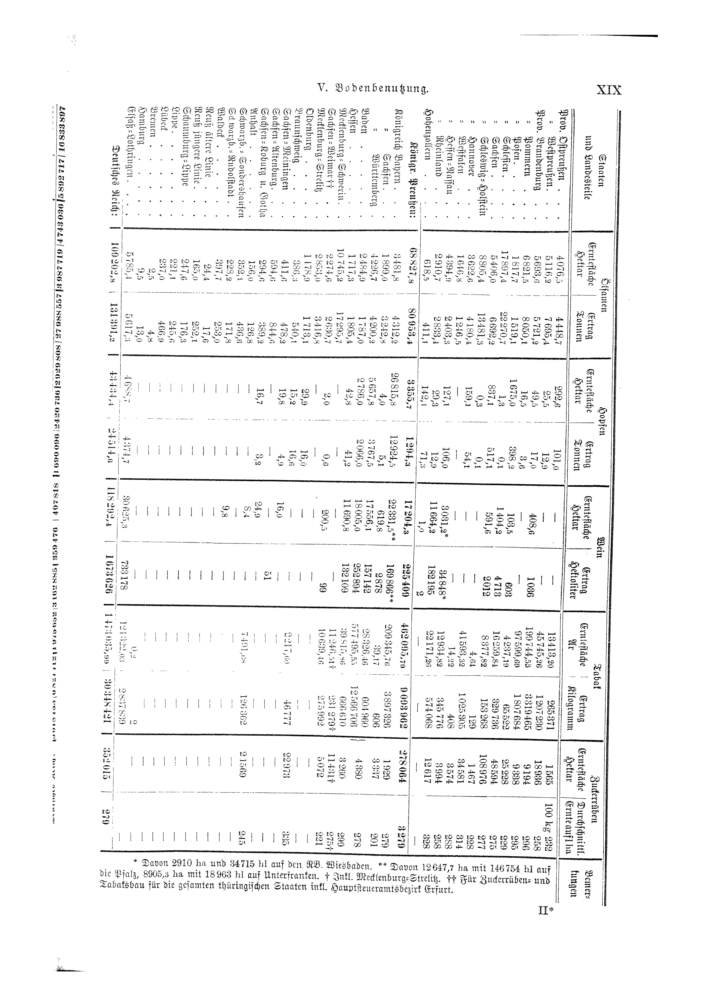 | Ernte-fläche Hektar | Ertrag Tonnen | Ernte-fläche Hektar | Ertrag Tonnen | Ernte-fläche Hektar | Ertrag Hektoliter | Ernte-fläche Ar | Ertrag Kilogramm | Ernte-fläche Hektar | Durchschnittl. Ernte auf 1 ha | ||