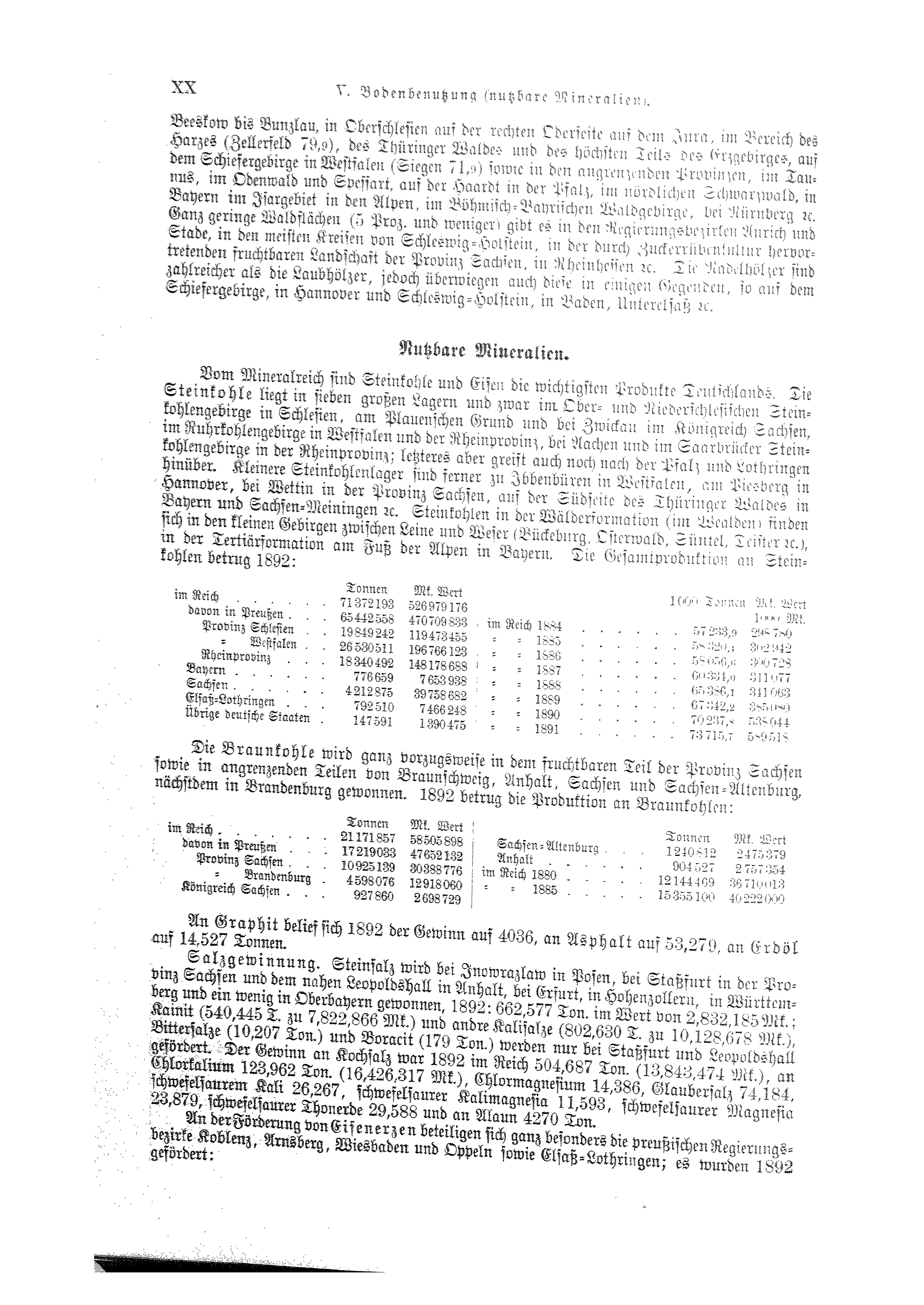 Vom MIneralreich sind Steinkohle und Eisen die wichtigsten Produkte Deutschlands. Die Steinkohle liegt in sieben großen Lagern und zwar in Ober- und nIrderschlesischen Steinkoelngebirge in Schlesien, am Plauenschen Grund und bei Zwickau im Königreich Sachsen, im Ruhrkohlengebirge in Westfalen und der Rheinprovinz, bei Aachen und im Saarbrücker Steinkohelngebirge in der Rehienprovinz; letzeres aber greift auch noch nach der Pfalz und Lothringen hinüber. Kleinere Steinkohlenlager sind ferner zu Ibbenbüren in WEstfalen, am Piesberg in Hannover, bei Wettin in der Provinz Sachsen, auf der Südseite des Thüringer Waldes in Bayern und Sachsen-Meiningen ets. Steinkohlen in der Wälderformation (im Wealden) finden sich in den kleinen Gebirgen zwischen Leine und WEser (Bückeburg, Osterwald, Süntel, Deister ets.) in der Tertiärformation an Fuß der Alpen in Bayern. Die Gesamtproduktion an Steinkohle betrug 1892: