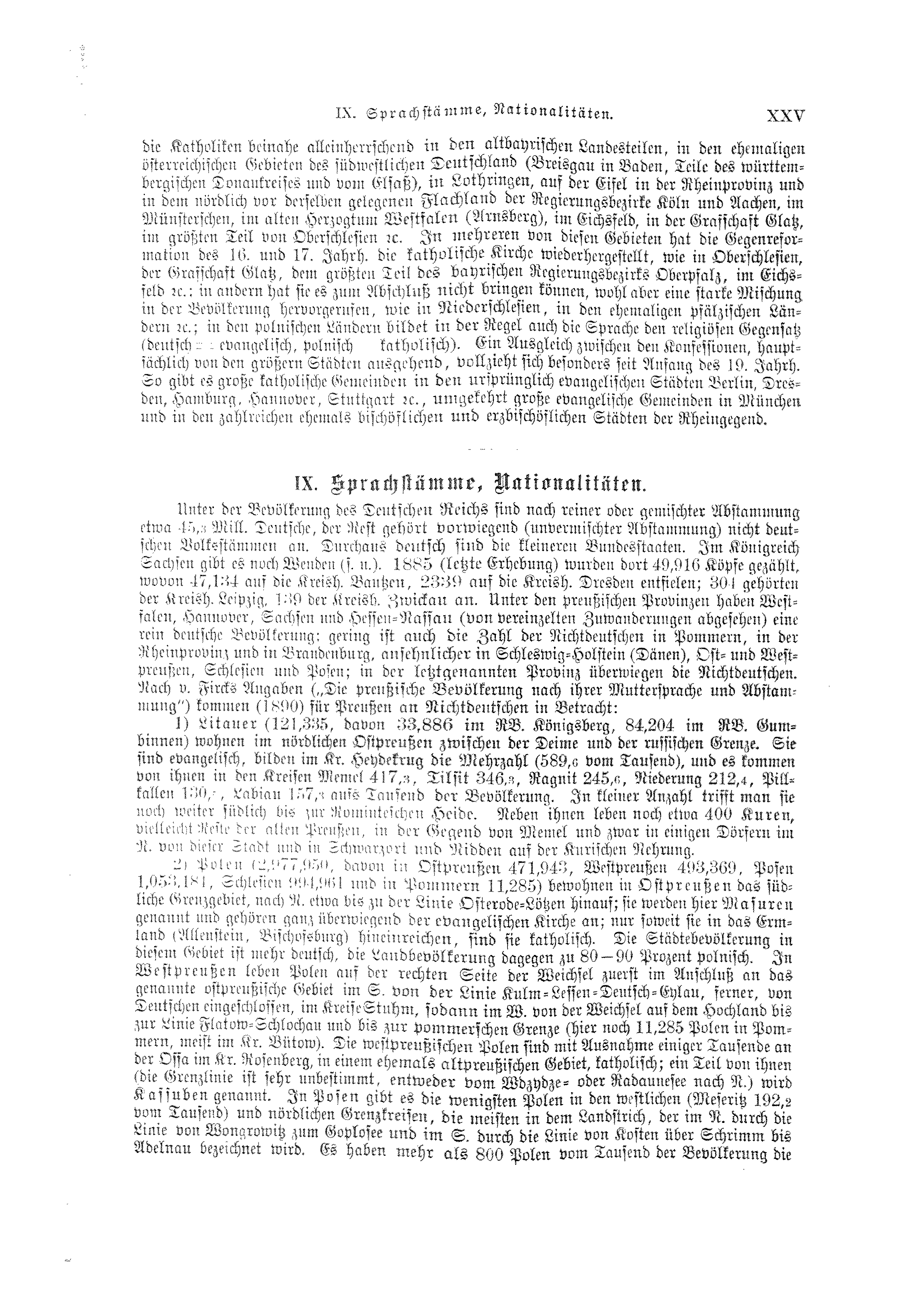 Unter der Bevölkerung des Deutschen Reichs sind nach reiner oder gemischter Abstammung etwa 45,3 Mill. Deutsche, der Rest gehört vorwiegend (unvermischte Abstammung) nicht deutschen Volksstämmen an. Durchaus deutsch sind die kleineren Bundesstaaten. Im Königreich Sachsen gibt es noch Wenden (s. u.). 1885 (letzte Erhebung) wurden dort 49,916 Köpfe gezählt, wovon 47,134 auf die Kreish. Bautzen, 2339 auf die Kreish. Dresden entfielen; 301 gehörten der Kreish. Leipzig, 139 der Kreish. Zwickau an. Unter den preußischen Provinzen haben Westfalen, Hannover, Sachsen und Hessen-Nassau (von vereinzelten Zuwanderungen abgesehen) eine rein deutsche Bevölkerung; Gering ist auch die Zahl der Nichtdeutschen in Pommern, in der Rheinprovinz und in Brandenburg, ansehnlicher in Schleswig-Holstein(Dänen), Ost- und westpreußen, Schlesien und Posen; in der letztgenannten Provinz überwiegen die Nichtdeutschen. Nach v. Finks Angaben(„Die preußische Bevölkerung nach ihrer Muttersprache und Abstammung“) kommen (1890) für Preußen an Nichtdeutschen in Betracht: