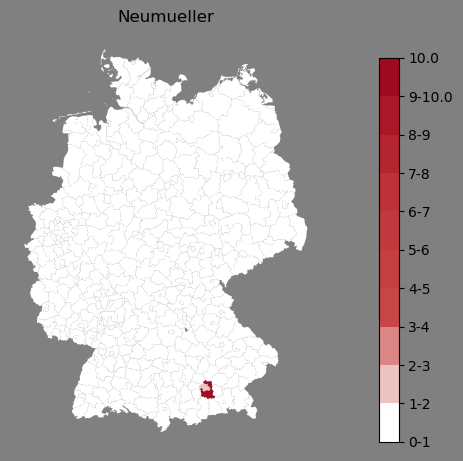 Relative Verteilung des Namens Neumueller (1996)Direkt zur Karte Die Farbskala zeigt die Anzahl von "Neumueller" bezogen auf je 1 Million Einträge. |