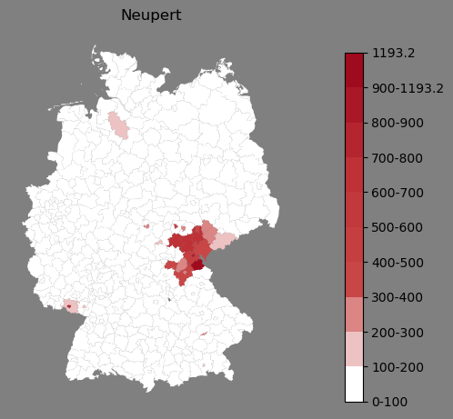 Relative Verteilung des Namens Neupert (1996)Direkt zur Karte Die Farbskala zeigt die Anzahl von "Neupert" bezogen auf je 1 Million Einträge. |