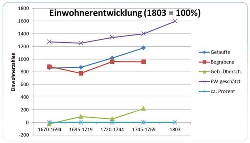 Diakon Johann Bertram Mielck im Jahr 1770: In 100 Jahren sind 444 mehr geboren als gestorben; wir tragen folglich alle 2 Jahre beynahe 9 Personen zur Vermehrung des menschlichen Geschlechtes bey. Rechnet man aber die letzten 25 Jahre besonders, so vermehren wir die Welt jährlich mit 10, und so man die vom Militärstand ausschliessen will, mit 8 Personen. Ein Beytrag, der nach Poportion der Einwohner ausnehmend gros ist.