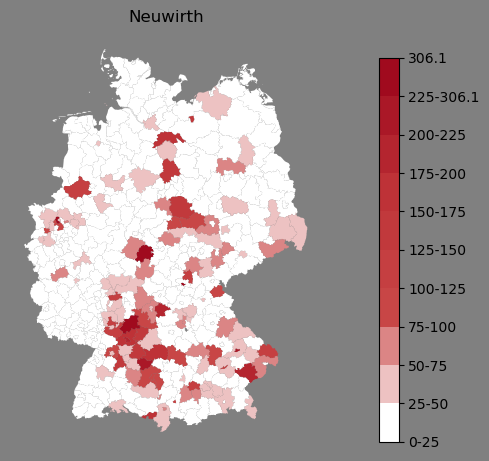 Relative Verteilung des Namens Neuwirth (1996)Direkt zur Karte Die Farbskala zeigt die Anzahl von "Neuwirth" bezogen auf je 1 Million Einträge. |
