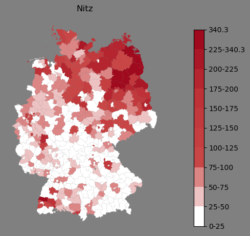 Relative Verteilung des Namens Nitz (1996)Direkt zur Karte Die Farbskala zeigt die Anzahl von "Nitz" bezogen auf je 1 Million Einträge. |