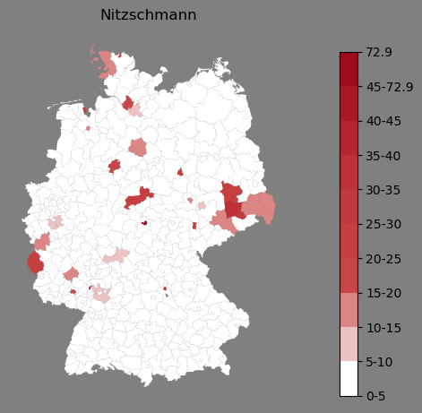 Relative Verteilung des Namens Nitzschmann (1996)Direkt zur Karte Die Farbskala zeigt die Anzahl von "Nitzschmann" bezogen auf je 1 Million Einträge. |