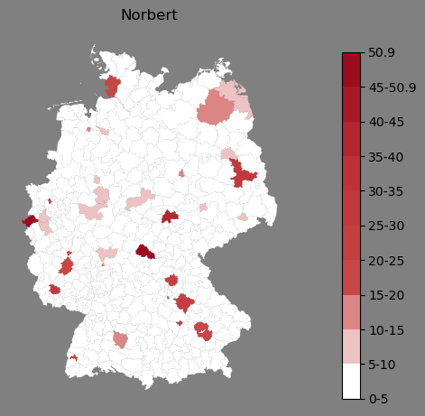Relative Verteilung des Namens Norbert (1996)Direkt zur Karte Die Farbskala zeigt die Anzahl von "Norbert" bezogen auf je 1 Million Einträge. |