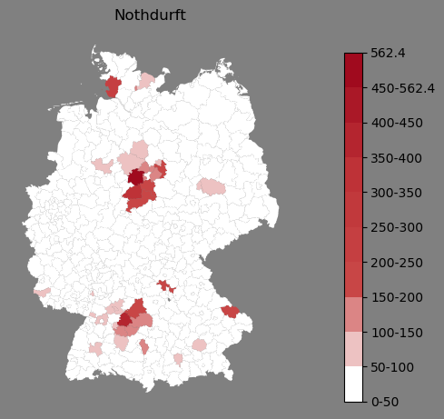 Relative Verteilung des Namens Nothdurft (1996)Direkt zur Karte Die Farbskala zeigt die Anzahl von "Nothdurft" bezogen auf je 1 Million Einträge. |