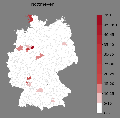Relative Verteilung des Namens Nottmeyer (1996)Direkt zur Karte Die Farbskala zeigt die Anzahl von "Nottmeyer" bezogen auf je 1 Million Einträge. |