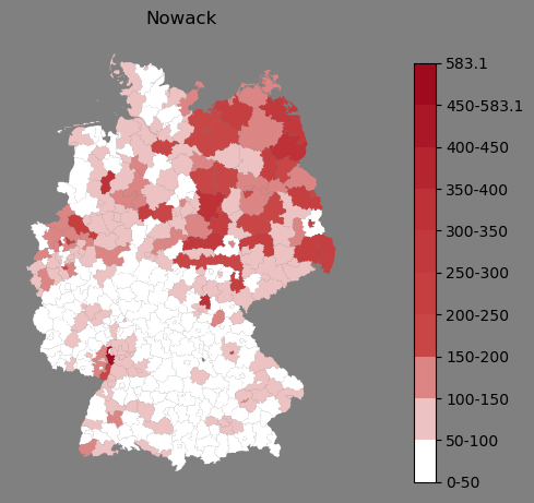 Relative Verteilung des Namens Nowack (1996)Direkt zur Karte Die Farbskala zeigt die Anzahl von "Nowack" bezogen auf je 1 Million Einträge. |
