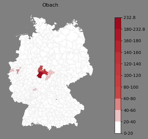 Relative Verteilung des Namens Obach (1996)Direkt zur Karte Die Farbskala zeigt die Anzahl von "Obach" bezogen auf je 1 Million Einträge. |