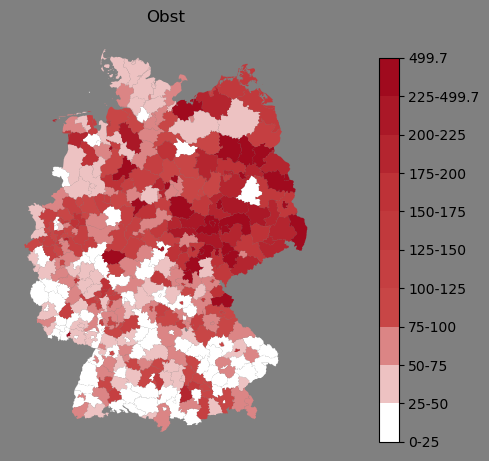 Relative Verteilung des Namens Obst (1996)Direkt zur Karte Die Farbskala zeigt die Anzahl von "Obst" bezogen auf je 1 Million Einträge. |