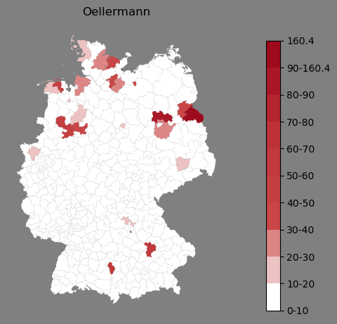Relative Verteilung des Namens Oellermann (1996)Direkt zur Karte Die Farbskala zeigt die Anzahl von "Oellermann" bezogen auf je 1 Million Einträge. |