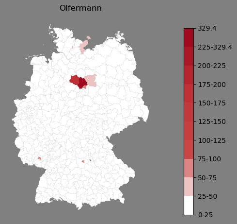Relative Verteilung des Namens Olfermann (1996)Direkt zur Karte Die Farbskala zeigt die Anzahl von "Olfermann" bezogen auf je 1 Million Einträge. |