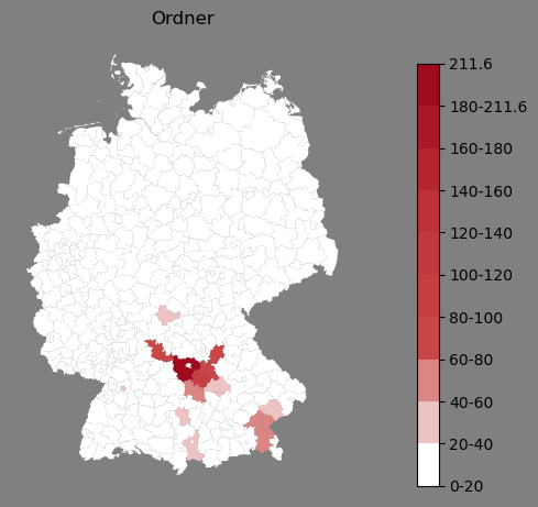 Relative Verteilung des Namens Ordner (1996)Direkt zur Karte Die Farbskala zeigt die Anzahl von "Ordner" bezogen auf je 1 Million Einträge. |
