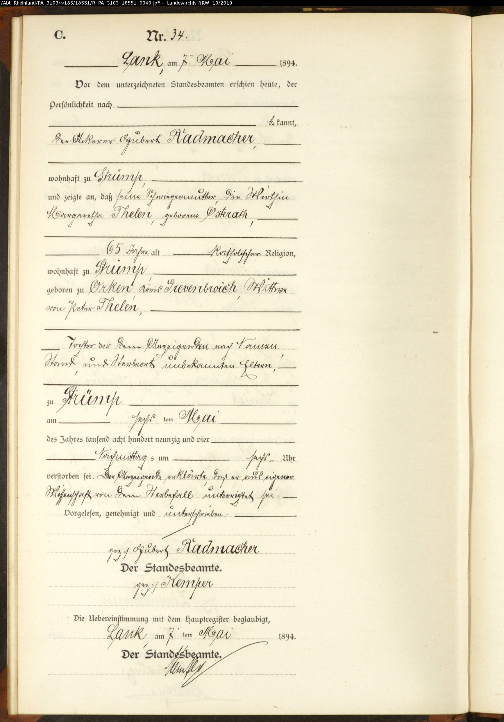 - Margaretha Osterath, geb. in Orken, ca. 1829, verst. 06. Mai 1894 in Strümp (heute Meerbusch),65 Jahre alt, Wittwe von Peter Thelen, Wirthin zu Strümp Sterberegister 34/1894 Standeamt Lank