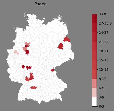 Relative Verteilung des Namens Pader (1996)Direkt zur Karte Die Farbskala zeigt die Anzahl von "Pader" bezogen auf je 1 Million Einträge. |