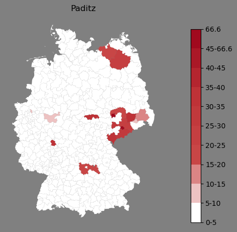 Relative Verteilung des Namens Paditz (1996)Direkt zur Karte Die Farbskala zeigt die Anzahl von "Paditz" bezogen auf je 1 Million Einträge. |
