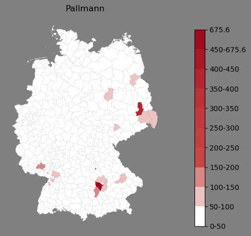 Relative Verteilung des Namens Pallmann (1996)Direkt zur Karte Die Farbskala zeigt die Anzahl von "Pallmann" bezogen auf je 1 Million Einträge. |
