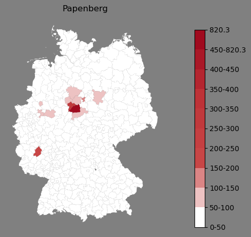 Relative Verteilung des Namens Papenberg (1996)Direkt zur Karte Die Farbskala zeigt die Anzahl von "Papenberg" bezogen auf je 1 Million Einträge. |