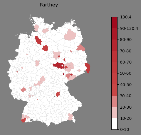 Relative Verteilung des Namens Parthey (1996)Direkt zur Karte Die Farbskala zeigt die Anzahl von "Parthey" bezogen auf je 1 Million Einträge. |