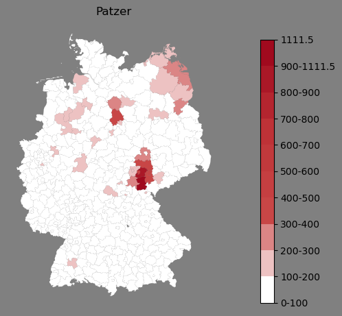 Relative Verteilung des Namens Patzer (1996)Direkt zur Karte Die Farbskala zeigt die Anzahl von "Patzer" bezogen auf je 1 Million Einträge. |
