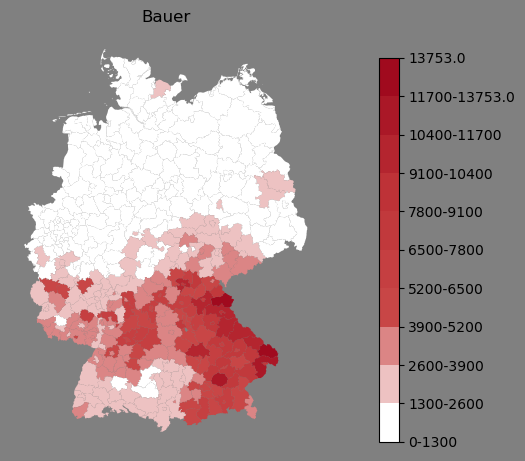Absolute Verteilung des Namens Bauer (1890)Direkt zur Karte Absolute Verteilung des Namens "Bauer" um 1890 im damaligen Deutschen Reich Sie können die Karte innerhalb des Fensters zoomen und verschieben. |