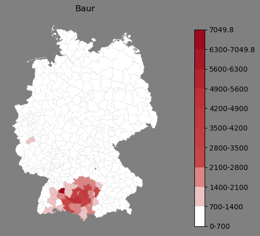 Absolute Verteilung des Namens Baur (1890)Direkt zur Karte Absolute Verteilung des Namens "Baur" um 1890 im damaligen Deutschen Reich Sie können die Karte innerhalb des Fensters zoomen und verschieben. |