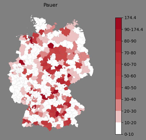 Absolute Verteilung des Namens Pauer (1890)Direkt zur Karte Absolute Verteilung des Namens "Pauer" um 1890 im damaligen Deutschen Reich Sie können die Karte innerhalb des Fensters zoomen und verschieben. |