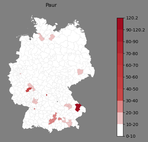 Relative Verteilung des Namens Paur (1996)Direkt zur Karte Die Farbskala zeigt die Anzahl von "Paur" bezogen auf je 1 Million Einträge. |