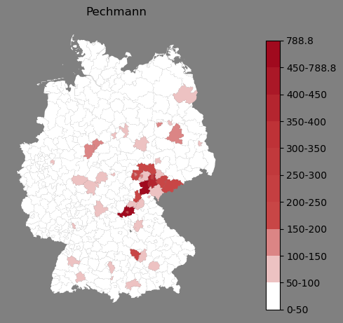 Relative Verteilung des Namens Pechmann (1996)Direkt zur Karte Die Farbskala zeigt die Anzahl von "Pechmann" bezogen auf je 1 Million Einträge. |