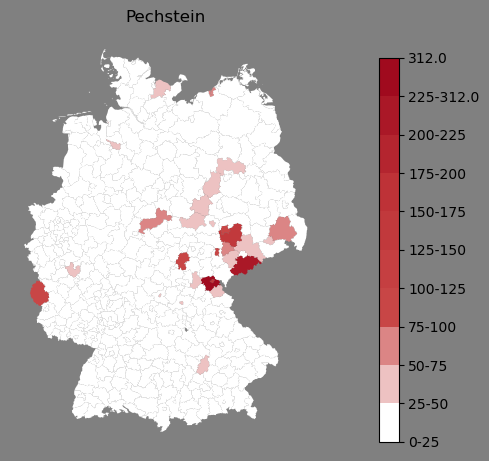 Relative Verteilung des Namens Pechstein (1996)Direkt zur Karte Die Farbskala zeigt die Anzahl von "Pechstein" bezogen auf je 1 Million Einträge. |