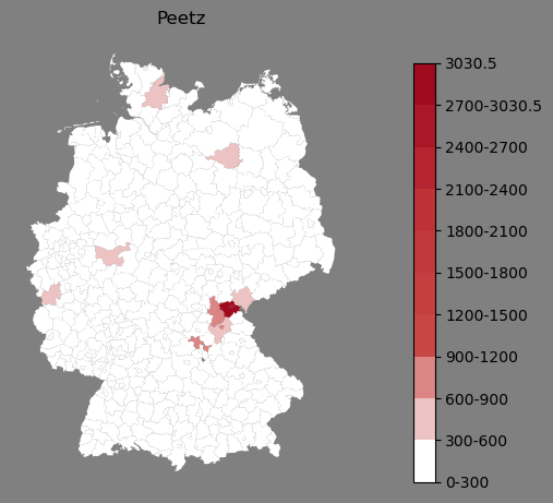 Relative Verteilung des Namens Peetz (1996)Direkt zur Karte Die Farbskala zeigt die Anzahl von "Peetz" bezogen auf je 1 Million Einträge. |