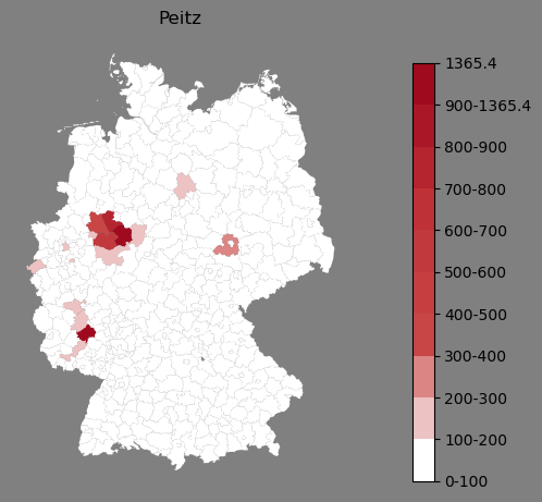 Relative Verteilung des Namens Peitz (1996)Direkt zur Karte Die Farbskala zeigt die Anzahl von "Peitz" bezogen auf je 1 Million Einträge. |