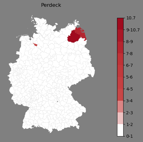 Relative Verteilung des Namens Perdeck (1996)Direkt zur Karte Die Farbskala zeigt die Anzahl von "Perdeck" bezogen auf je 1 Million Einträge. |