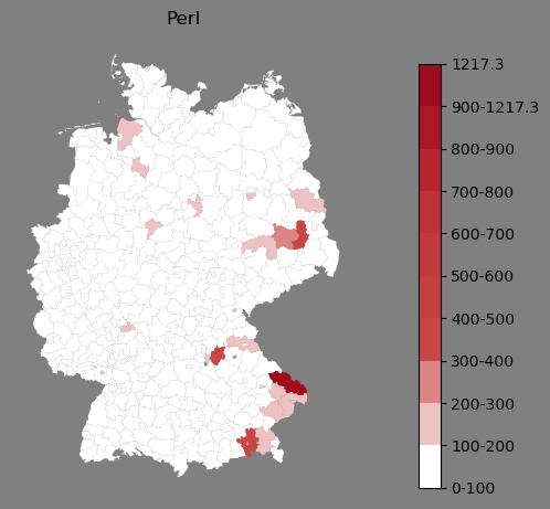 Relative Verteilung des Namens Perl (1996)Direkt zur Karte Die Farbskala zeigt die Anzahl von "Perl" bezogen auf je 1 Million Einträge. |