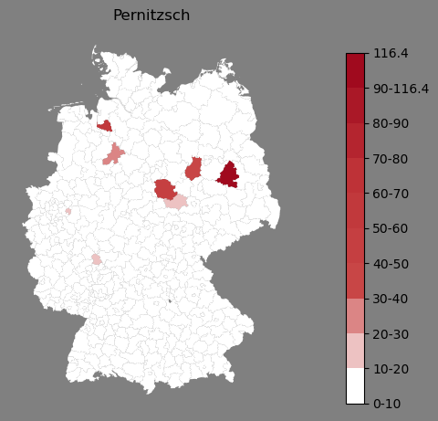 Relative Verteilung des Namens Pernitzsch (1996)Direkt zur Karte Die Farbskala zeigt die Anzahl von "Pernitzsch" bezogen auf je 1 Million Einträge. |