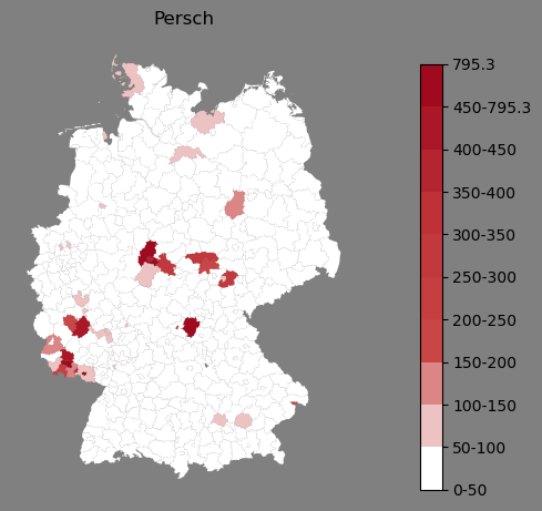 Relative Verteilung des Namens Persch (1996)Direkt zur Karte Die Farbskala zeigt die Anzahl von "Persch" bezogen auf je 1 Million Einträge. |