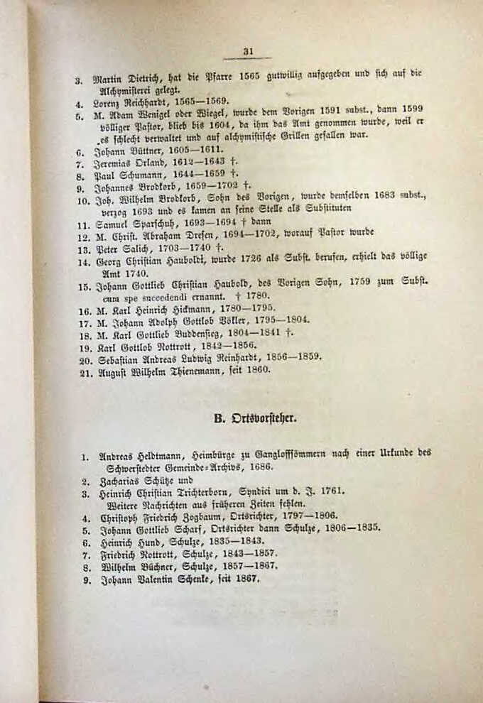 - M. Adam Wenigel oder Wiegel, wurde dem Vorigen 1591 subst., dan 1599 völliger Pastor, blieb bis 1604, da ihm das Amt genommen wurde, weil er es schlecht verwaltet und auf alchymistische Grillen gefallen war.