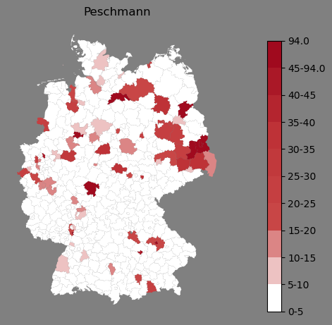 Relative Verteilung des Namens Peschmann (1996)Direkt zur Karte Die Farbskala zeigt die Anzahl von "Peschmann" bezogen auf je 1 Million Einträge. |