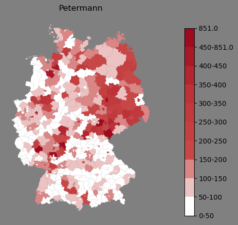 Relative Verteilung des Namens Petermann (1996)Direkt zur Karte Die Farbskala zeigt die Anzahl von "Petermann" bezogen auf je 1 Million Einträge. |