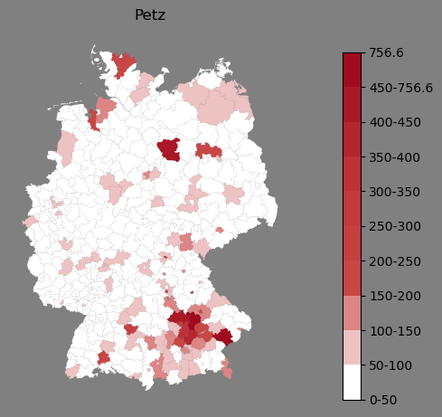 Relative Verteilung des Namens Petz (1996)Direkt zur Karte Die Farbskala zeigt die Anzahl von "Petz" bezogen auf je 1 Million Einträge. |