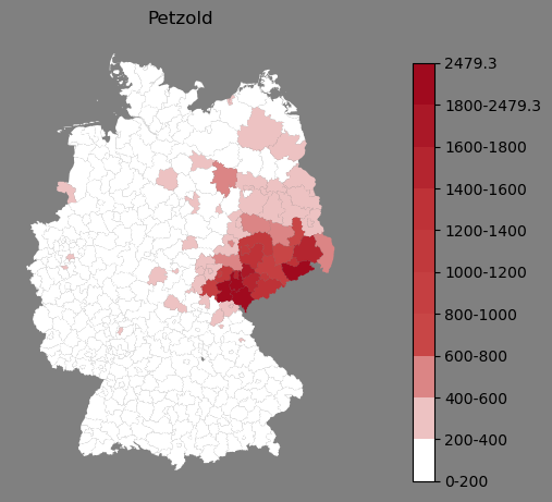 Absolute Verteilung des Namens Petzold (1890)Direkt zur Karte Absolute Verteilung des Namens "Petzold" um 1890 im damaligen Deutschen Reich Sie können die Karte innerhalb des Fensters zoomen und verschieben. |