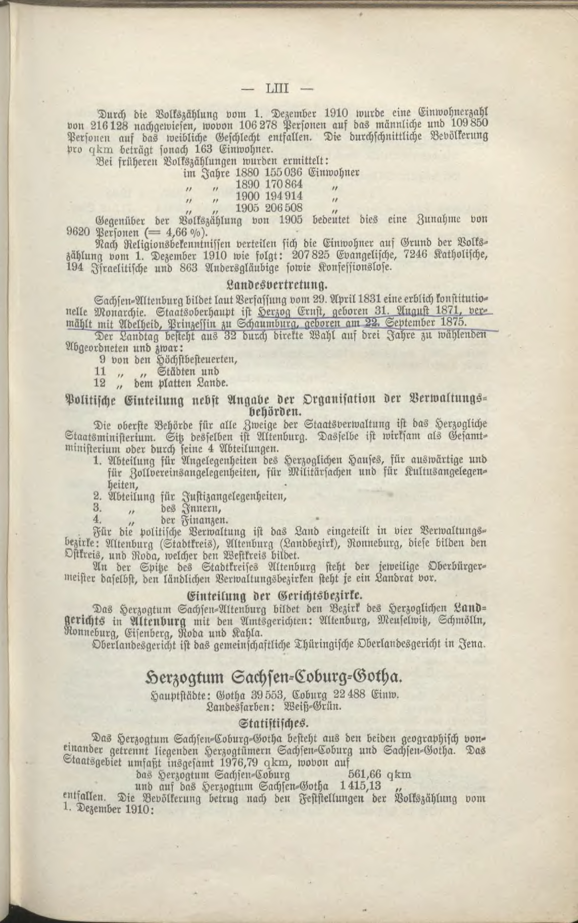 Sachsen-Altenburg bildet laut Verfassung vom 29. April 1831 eine erblich konstitutionelle Monarchie. Staatsoberhaupt ist Herzog Ernst, geboren 31. August 1871, vermählt mit Adelheid, Prinzessin zu Schaumbung, geboren am 22. September 1875.