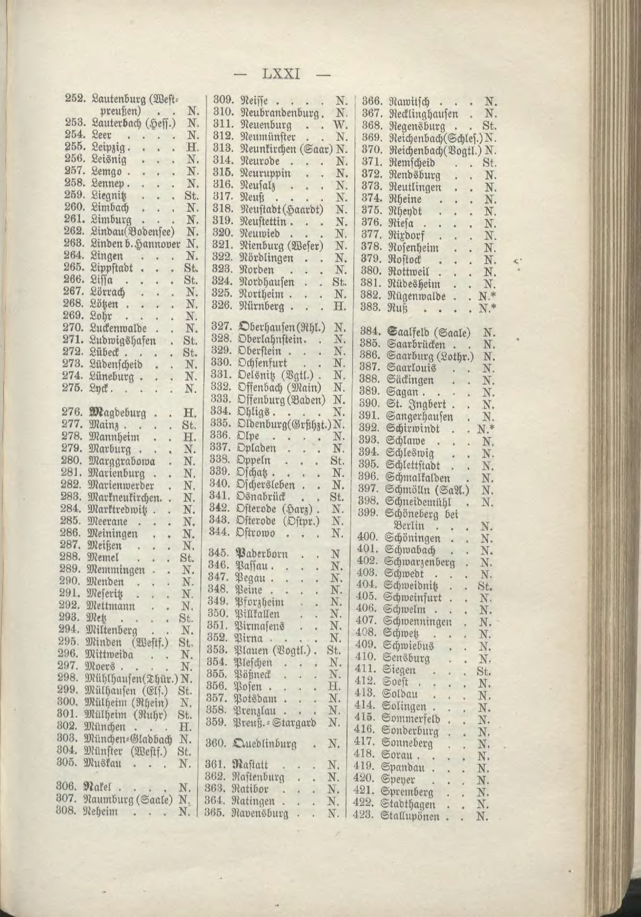 | 255. | Leipzig. | H. | 312. | Neumünster | N. | 369. | Reichenbach (Schles.) | N. |
