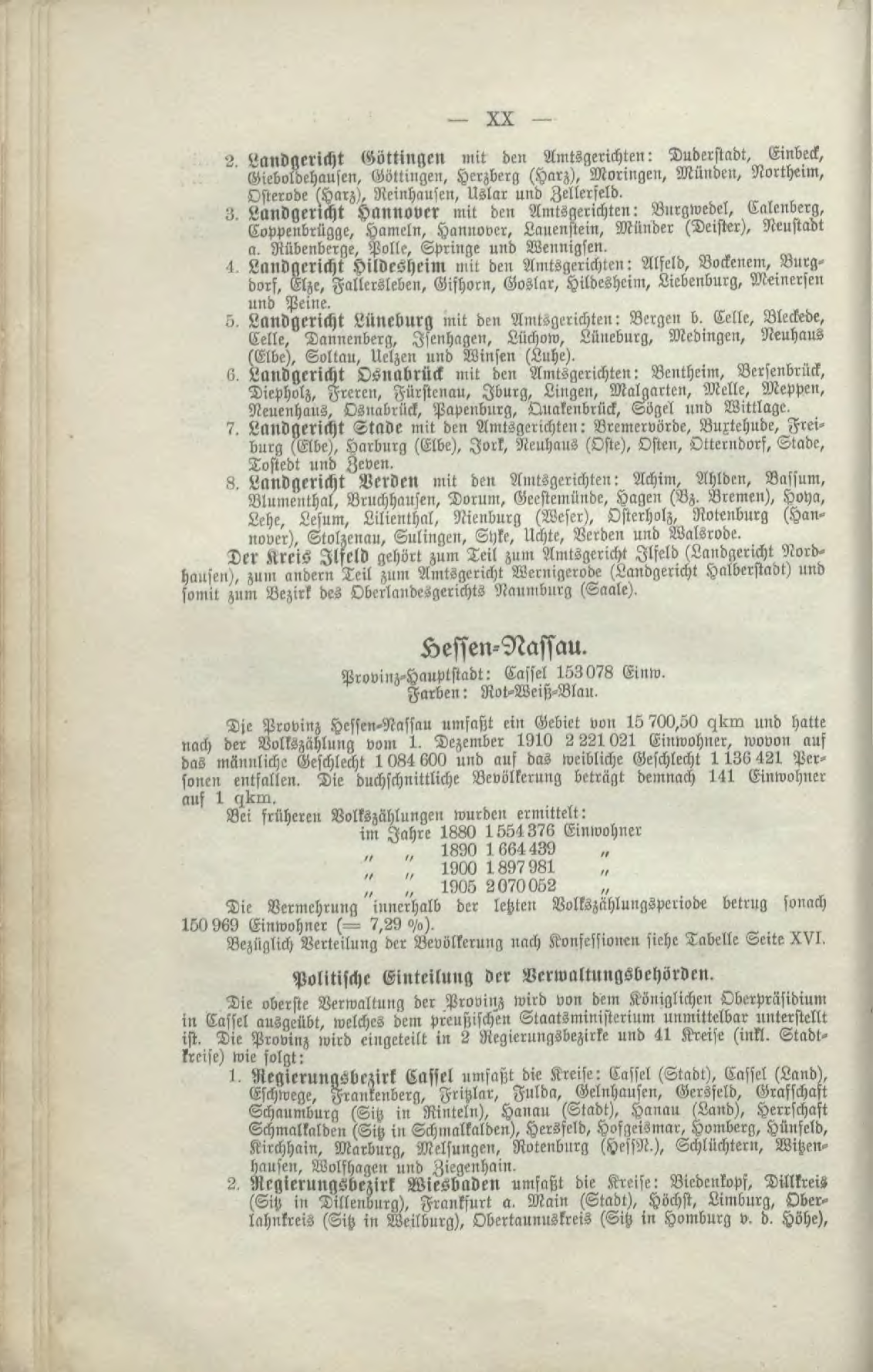 Die Provinz Hessen-Nassau umfaßt ein Gebiet von 15.700,50 qkm und hatte nach der Volkszählung vom 1. Dezember 1910 2.221.021 Einwohner, wovon auf das männliche Geschlecht 1.084.600 und aus das weibliche Geschlecht 1.136.421 Personen entfallen. Die durchschnittliche Bevölkerung beträgt demnach 141 Einwohner auf 1 qkm.